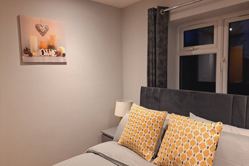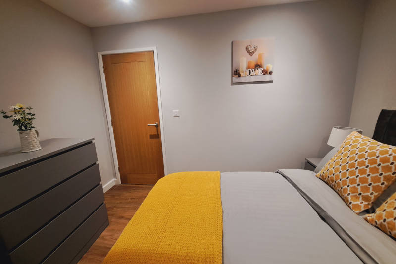 This bright and fresh bedroom measures 99sq.ft. It has a comfortable double bed ,clean soft linens, bedside drawers and lamps, a wardrobe and drawers for storage, extra pillows and block out curtains. The bedroom boasts high-end comforts that allow guests to rest after a busy day.